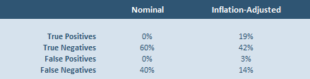 The table above shows the results at the 50% probability level. From this we see that the inflation-adjusted yield comfortably outperforms the nominal yield, especially as it records more True Positives, which is the principal signal we are looking for. As it turns out, nominal yields produced a lot of False Negatives.