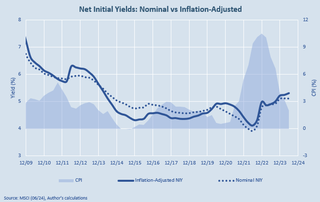 I then had my second (but apparently first original) Eureka moment; the real estate industry does not talk in ratios as the equity market does, but it does talk in yields. And what is a yield if not an inverted PE ratio? I chose to flip the CAPE into an inflation-adjusted net initial yield and haven’t looked back since1.