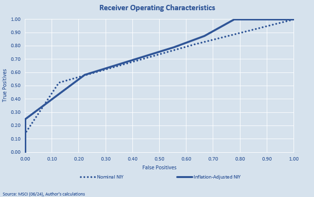 I therefore compare both the nominal yield and the inflation-adjusted yield on these two metrics using the Receiver Operating Characteristics methodology. A strong performance on the chart below would be represented by a vertical line; as probabilities increase, we see an increasing number of True Positives but no more False Positives. Conversely, a poor result would be represented by a horizontal line on the chart. Once again, it is clear from my analysis that the inflation-adjusted yield outperforms the nominal yield, particularly where the probabilities of being correct are high.